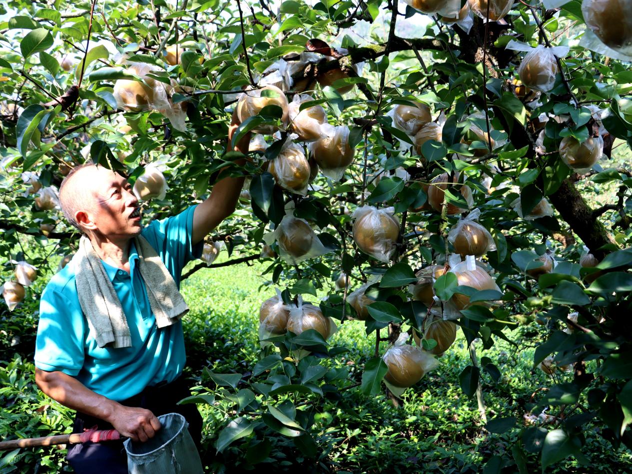 胡金安所在的村子充头自然村,金秋时节这里漫山遍野、房前屋后硕果满枝,沉甸甸的梨子挂满枝头,有些枝桠还搭着架子。